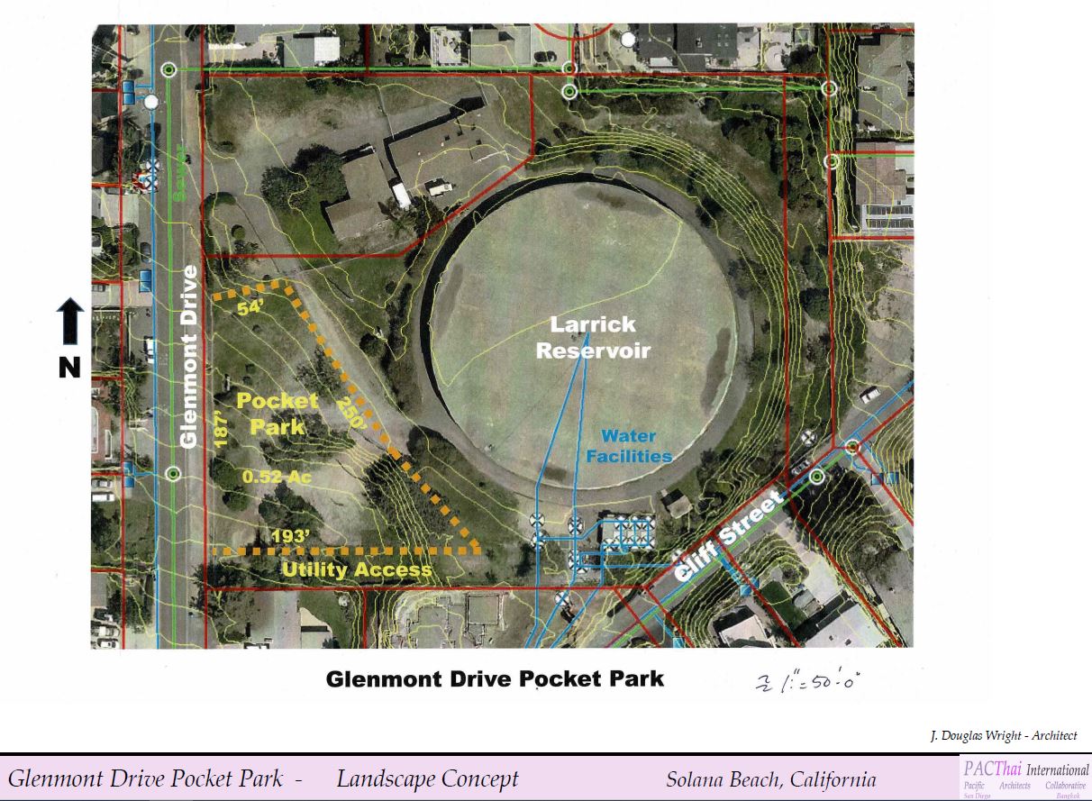 The City of Solana Beach is in the process of developing a preliminary design and concept plan for a small neighborhood park on approximately half an acre on the Santa Fe Irrigation water reservoir site located on Glenmont Drive. For discussion purposes, a passive open space concept that includes a meandering walking trail, drought-tolerant landscaping, pollinator garden areas, art nodes and potential sitting areas was prepared. The concept of this neighborhood park is proposed to work with the existing natural topography of the site while reflecting the coastal elements of Solana Beach while respecting the current use of Larrick Reservoir as a vital infrastructure element of our community.