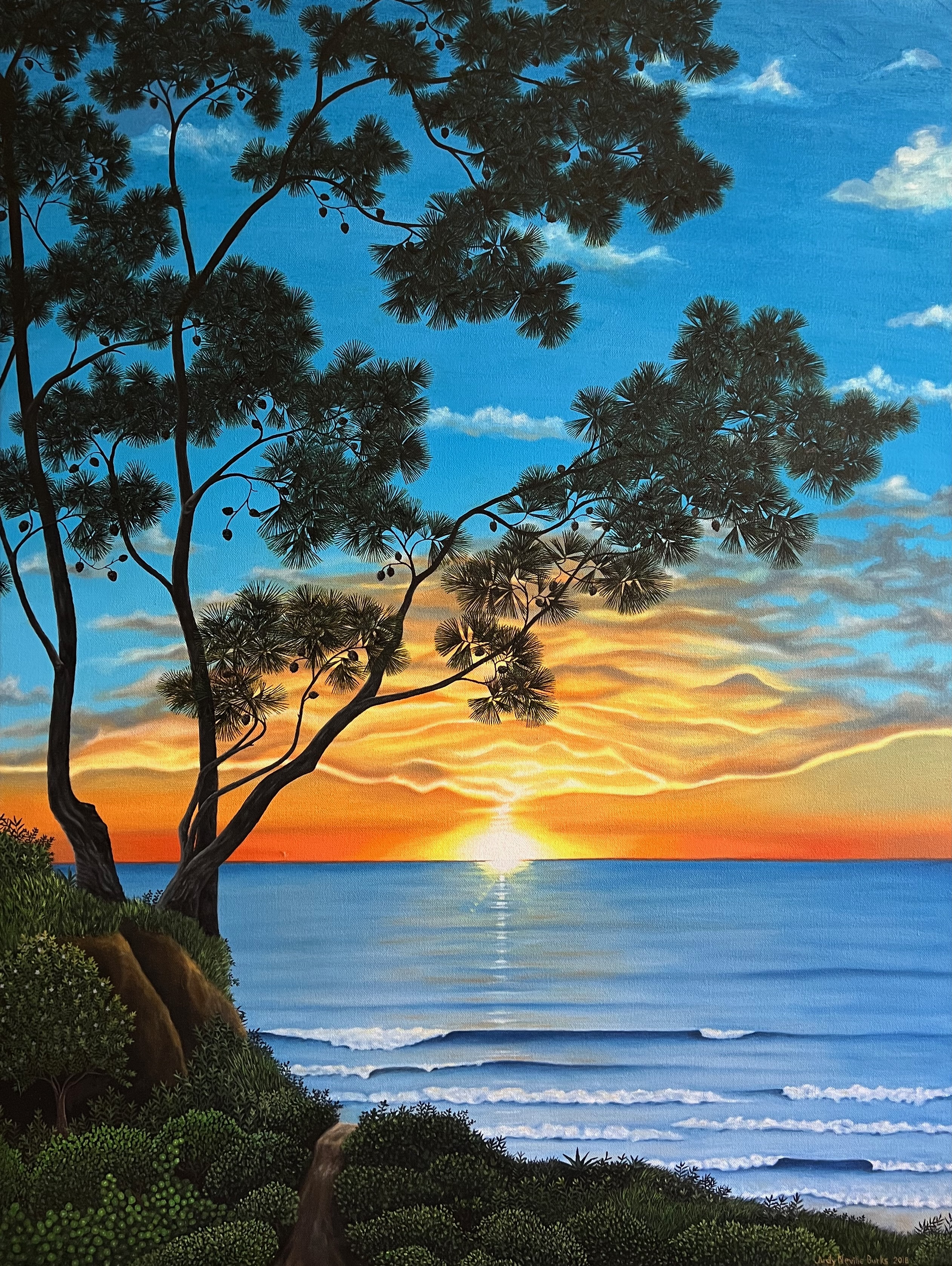 Solana-by-the-Sea is a solo exhibition by artist Tina Christiansen featuring more than 24 paintings that explore the unique seaside experience of Solana Beach. Through a mix of large and intimate canvases, Christiansen offers an up-close look at the beauty of the ocean and the life within it, from creatures beneath the surface to those searching for prey above. Her work combines glazing and thin water-media acrylic techniques with bold palette-knife impasto, creating a dynamic style that transcends realism. Christiansen’s paintings capture shimmering light filtering through kelp forests, the movement of waves, and the moody fog of a Solana sunset, revealing the mystery and energy of the sea.