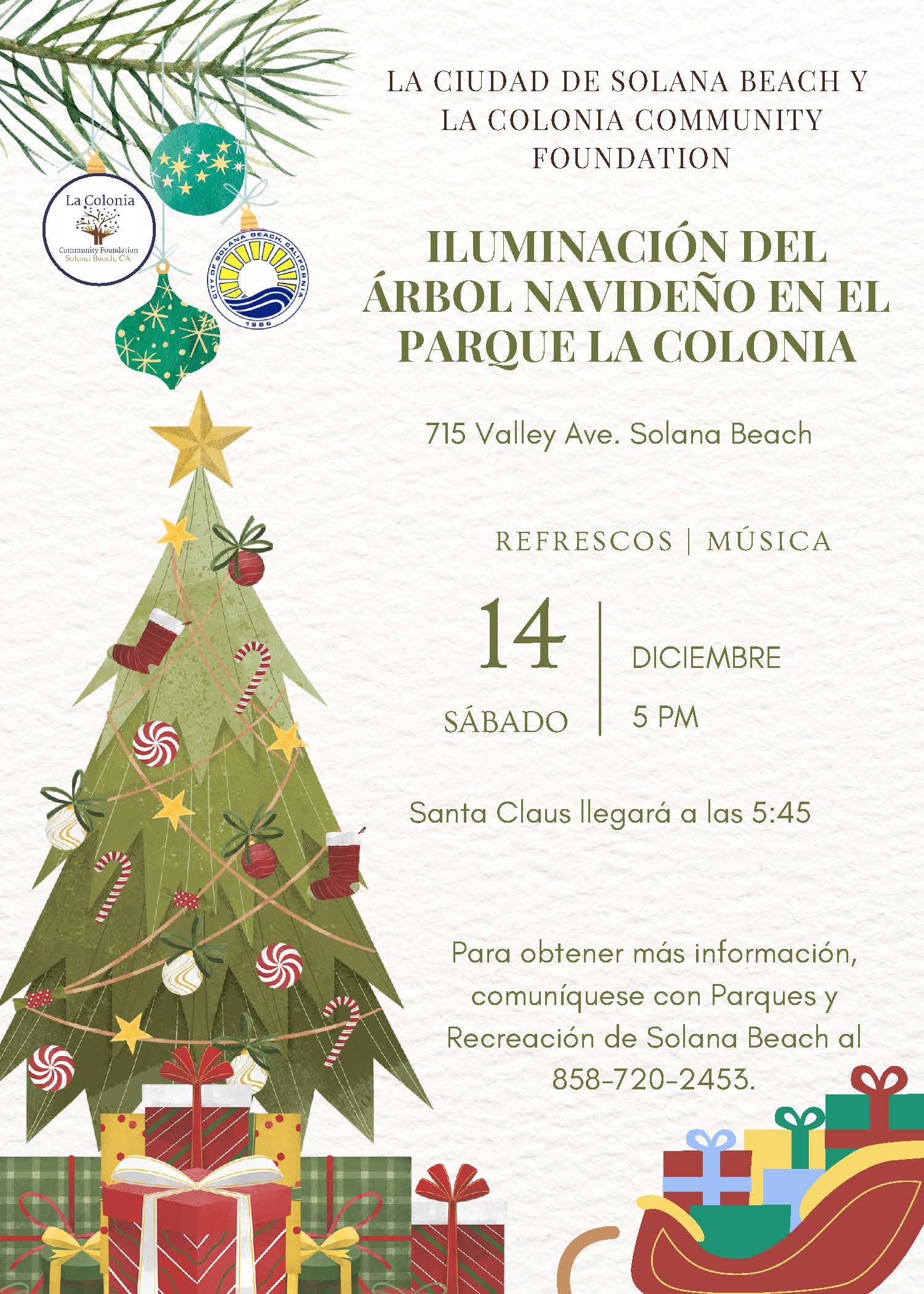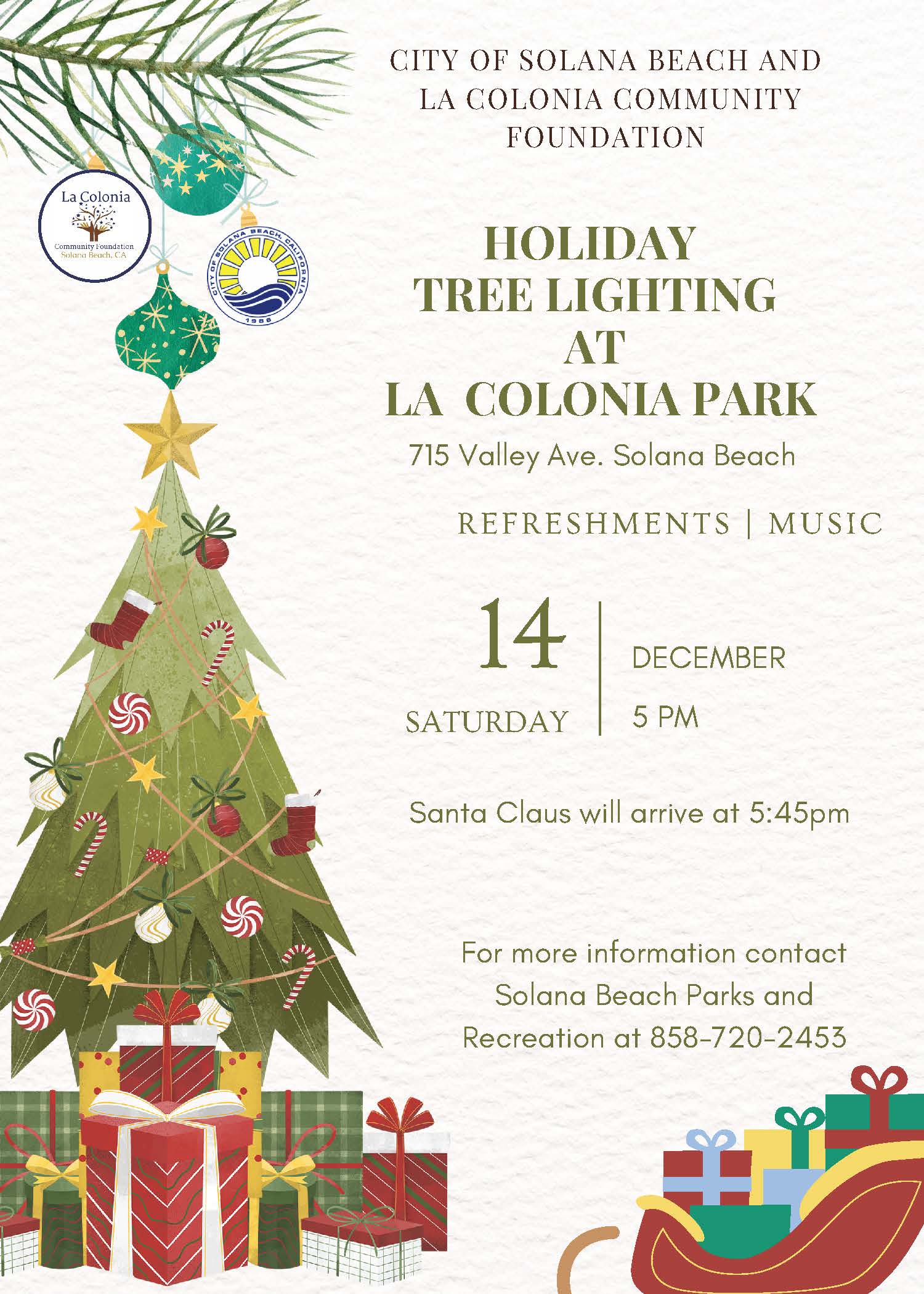 The City of Solana Beach and La Colonia Community Foundation are hosting a Holiday Tree Lighting Event at La Colonia Park on Saturday, December 14th, from 5:00pm to 7:00pm.  This family friendly event is free and open to the public.