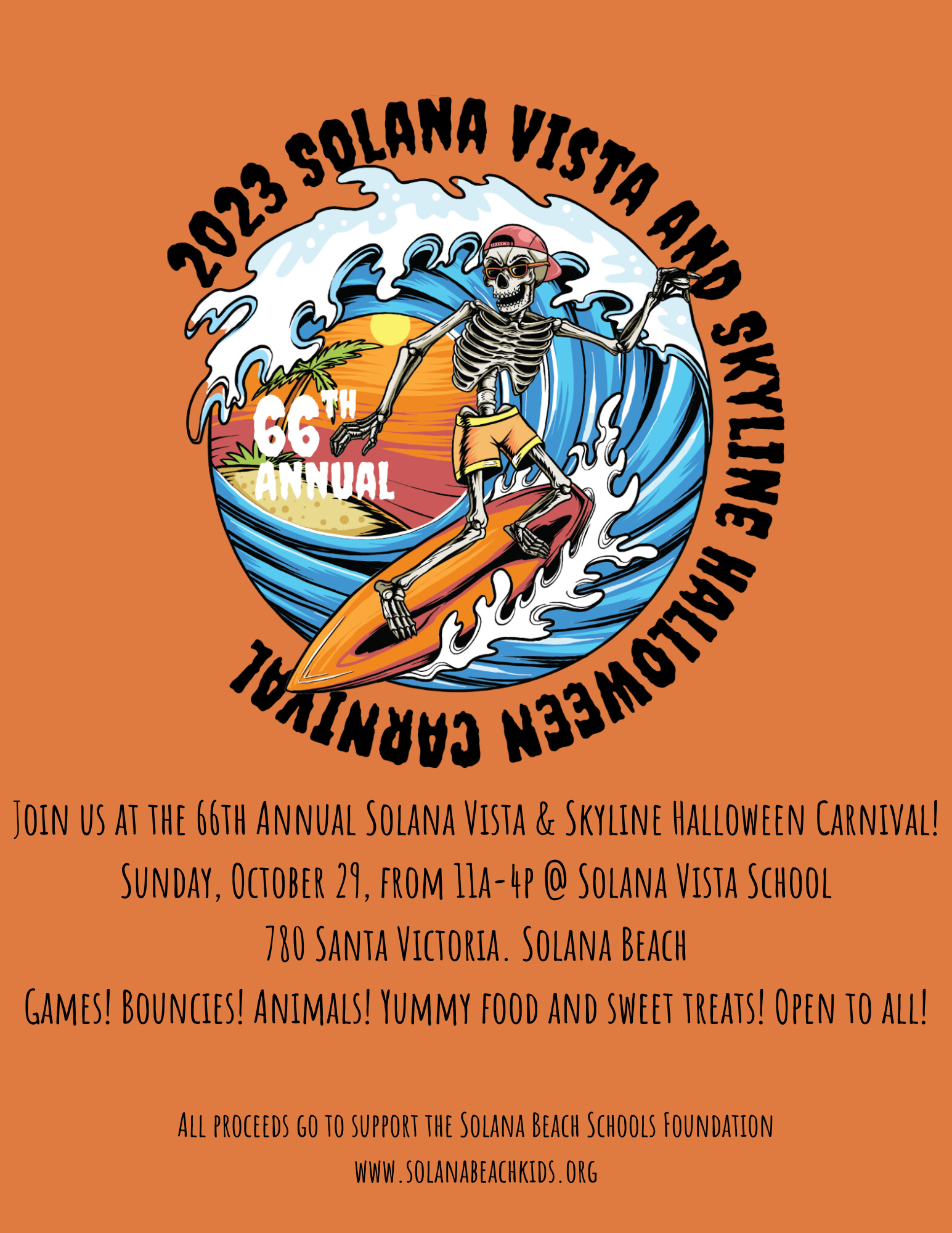 The annual Solana Vista/Skyline Halloween Carnival is back and celebrating its 66th anniversary on Sunday, October 39th, from 11:00 AM to 4:00 PM, at Solana Vista Elementary All community members are welcome and encouraged to attend even if they don't have kids at the schools. The event features games, inflatables, raffles, pony rides, petting zoo, a costume contest, and much more. There will also be food from community partners, as well as other delicious treats like tamales, hot dogs, ice cream, and a bake sale.