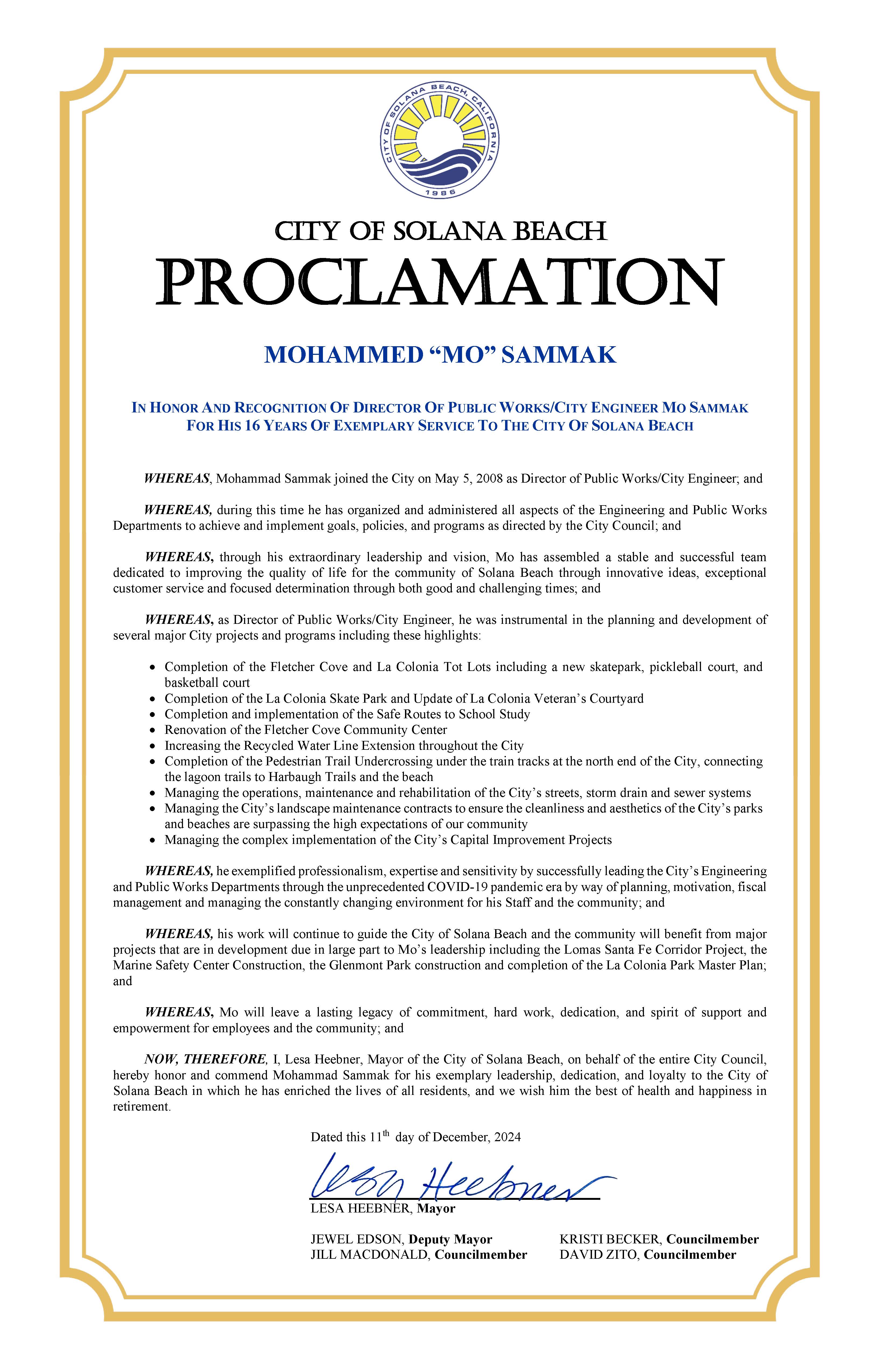 The City of Solana Beach bids a heartfelt farewell to Mo Sammak, our Director of Public Works/City Engineer, as he retires after 16 years of exemplary service. While we are excited for Mo as he begins this well-deserved next chapter, his leadership, dedication, and kindness will be deeply missed by the community he served so passionately.