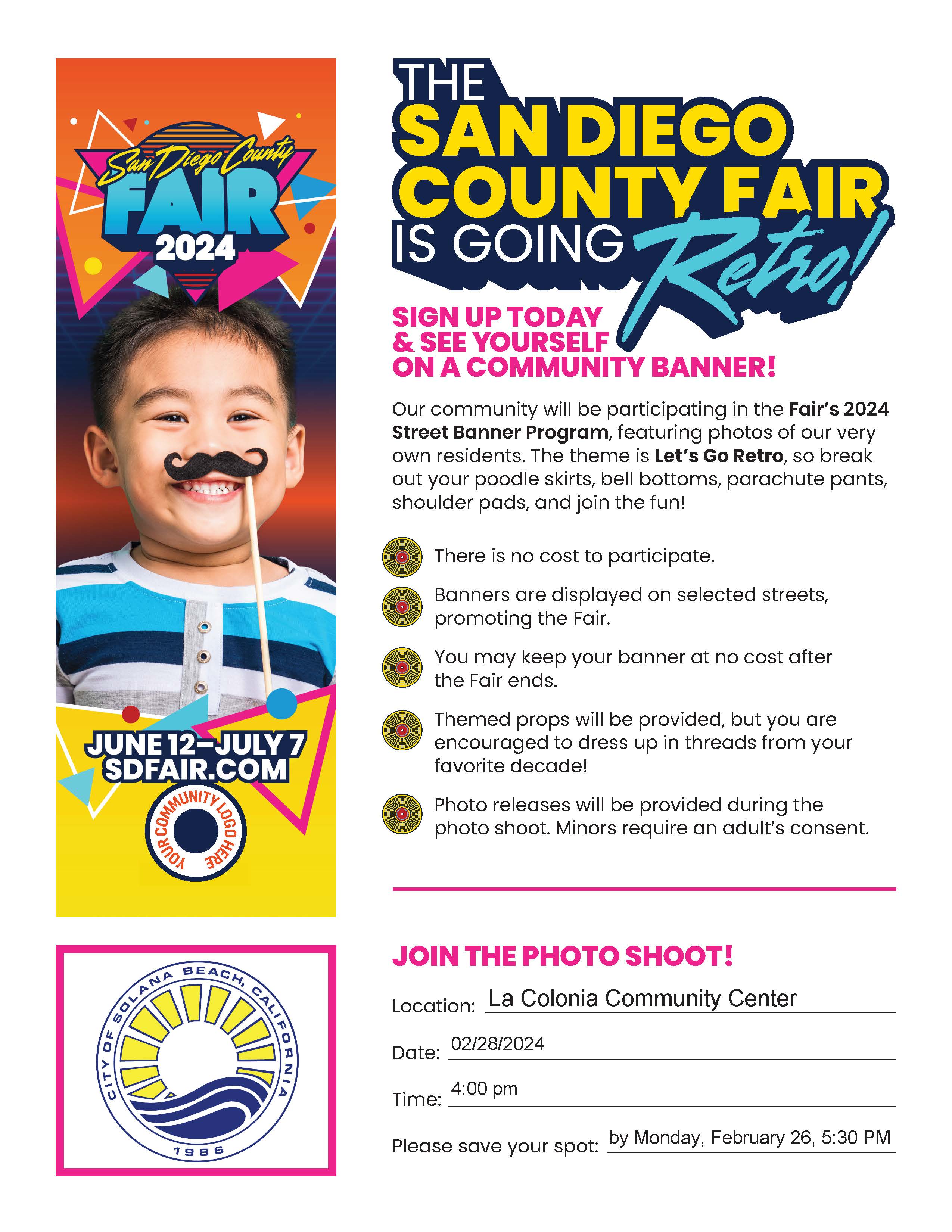 Our community will be participating in the Fair’s 2024 Street Banner Program, featuring photos of our very own residents. The theme is "Let’s Go Retro", so break out your poodle skirts, bell bottoms, parachute pants, shoulder pads, and join the fun!