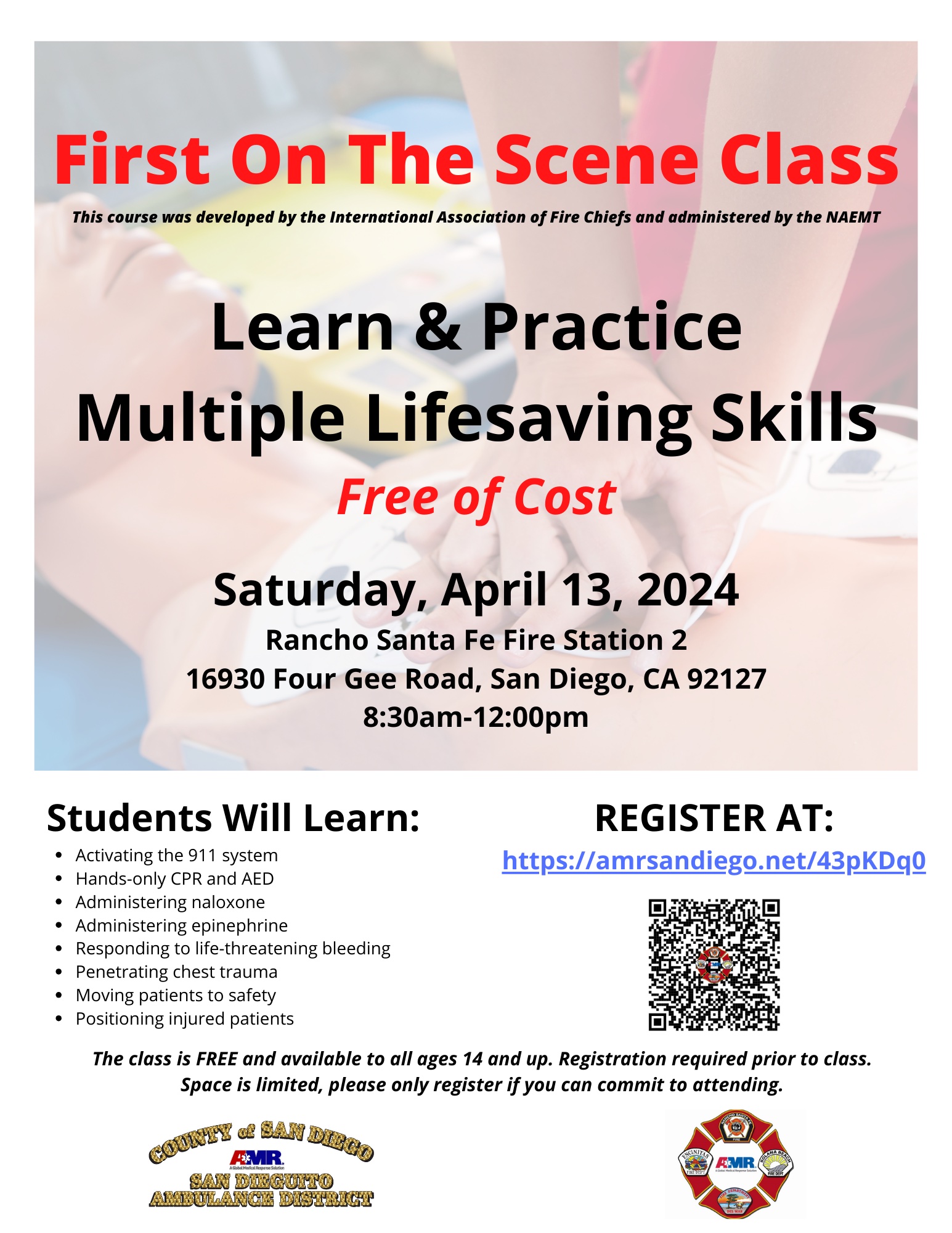 Get ready for an informative and practical session on Saturday, April 13, from 8:30 AM to 12:00 PM. The event will take place at the Rancho Sante Fe Fire Station 2, located at 16930 Four Gee Road, San Diego, CA 92127.