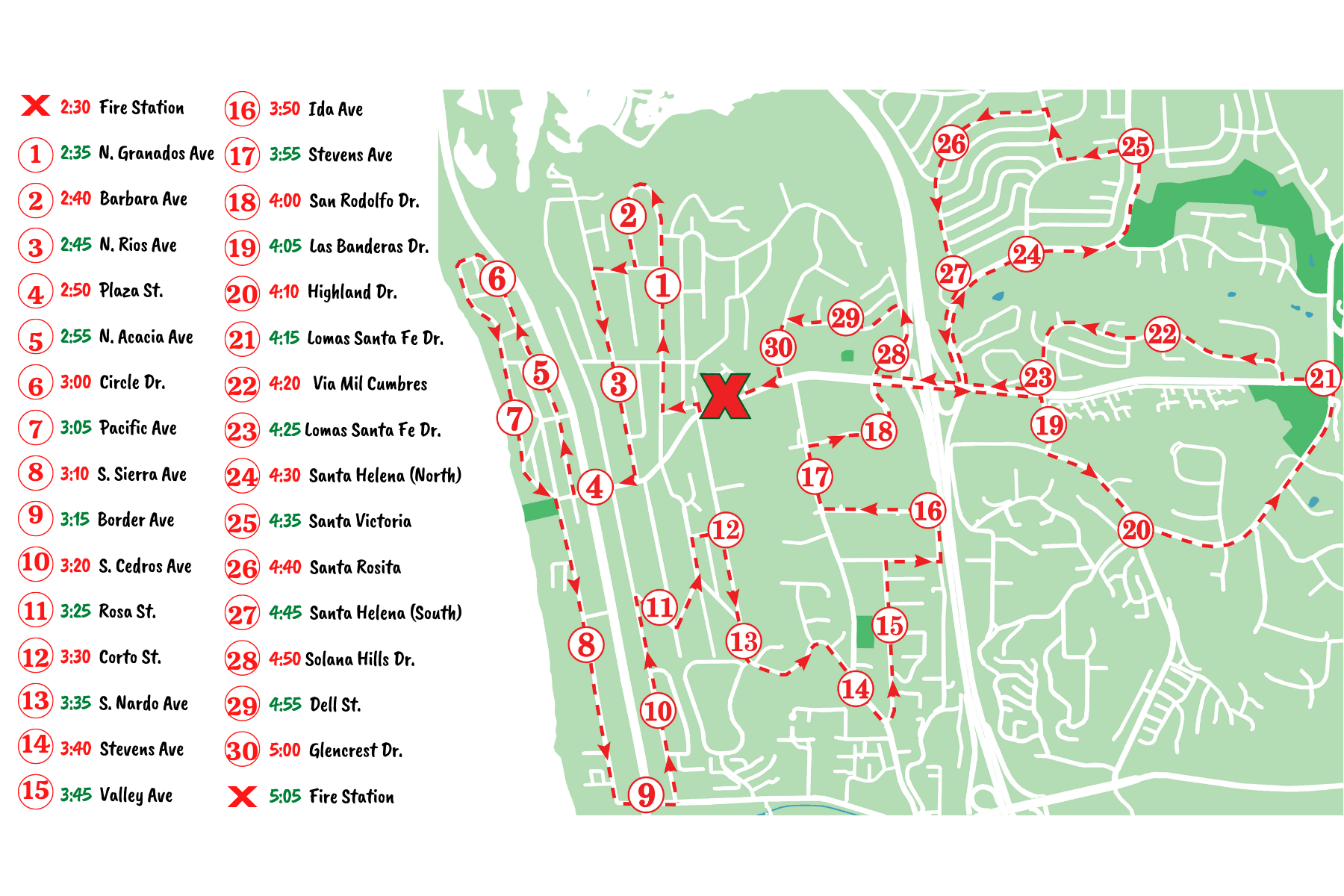 Back by popular demand, the City of Solana Beach and the Solana Beach Parks and Recreation Commission are excited to invite you to join your friends and neighbors in welcoming Santa Claus back to Solana Beach! Santa will be riding along with Fire, Sheriff and Marine Safety personnel. The Sleigh Ride will be starting and ending at the Solana Beach Fire Station, located at 500 Lomas Santa Fe Drive. Please view the map below to find the estimated time when Santa will be near you.