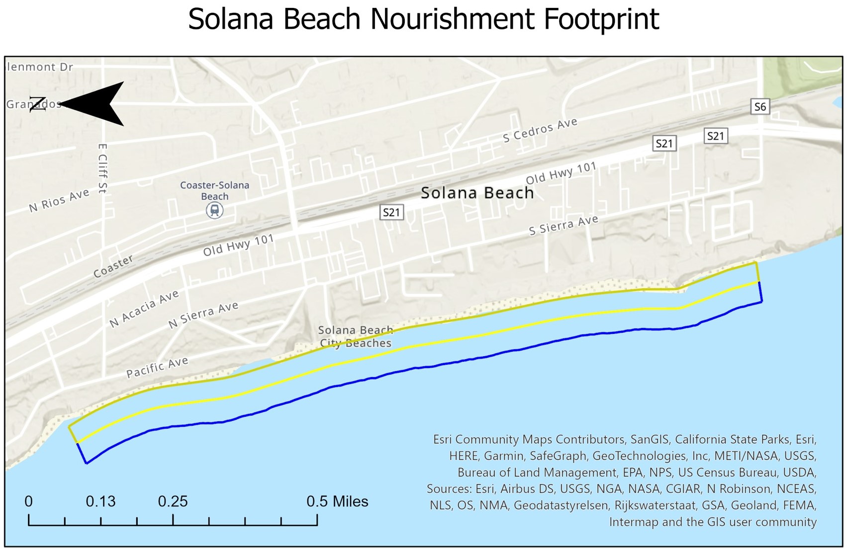 This Project will construct a 150-foot-wide beach along 7,200 feet of beach covering the entire City of Solana Beach shoreline.  The project will create nearly 25 acres of new public beach area.  Sand is being obtained from an offshore borrow site located offshore of the mouth of the San Dieguito River. The material will be pumped via submerged hydraulic pipeline and dewatered on the beach before being shaped into a new beach by heavy equipment on the beach.